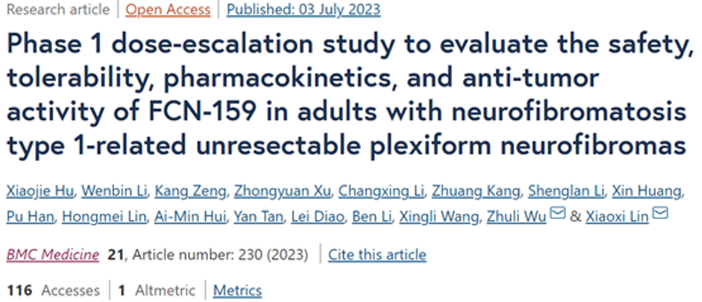 2. Hu X, et al. Phase 1 dose-escalation study to evalsuate the safety, tolerability, pharmacokinetics, and anti-tumor activity of FCN-159 in adults with neurofibromatosis type 1-related unresectable plexiform neurofibromas. BMC Med. 2023 Jul 3;21(1):230. doi: 10.1186/s12916-023-02927-2.